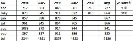 Let’s move onto doubles because contrary to popular belief, power isn’t only about home runs. Legitimate power can and will result in a boatload of double as well. April 2008 gave us the highest double output of all the years studied by far meaning that heading into May it seemed that the assumed power outage had little behind it. The double output in May was only 99% of the average from the sample size once again lending credence those in favor of a power outage.