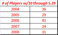 After all, 31 starting pitchers have earned run averages below 3.50. And 19 starting pitchers have FIP measures below 3.50. Four of the pitchers with a FIP below 3.50 have an ERA above 3.50 essentially meaning they have been bitten by some bad luck. Unfortunately, I was unable to find an easy way to put together the data to see how many players had similar figures in previous seasons. For all of 2007, only 17 pitchers were on the right side of 3.50 in the ERA category and only nine of them held a <3.50 FIP.