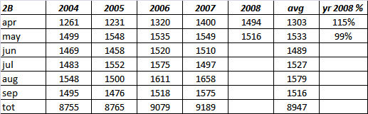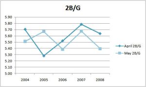Let’s move onto doubles because contrary to popular belief, power isn’t only about home runs. Legitimate power can and will result in a boatload of double as well. April 2008 gave us the highest double output of all the years studied by far meaning that heading into May it seemed that the assumed power outage had little behind it. The double output in May was only 99% of the average from the sample size once again lending credence those in favor of a power outage.