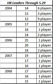 To get an idea of how much, if any, power has dissipated from the game, I looked at several things: Slugging Percentage, Home Runs and Doubles. I also looked at weather just to see if anything interesting struck me, but I don’t think that would come into play until late in the year. I went back to 2004 giving me a complete four-year sampling to compare the first two months of 2008 against. First, I’ll show some of the simpler data I compiled that probably doesn’t have huge correlations year-over-year but can be “fun” to look at when discussing these kinds of things. The following charts focus on the concentration of home runs meaning they fail in giving us the scope we need to judge how far up or down the league’s power is or isn’t right now. What they do offer is an interesting look into how the premier hitters performed during the period studied.