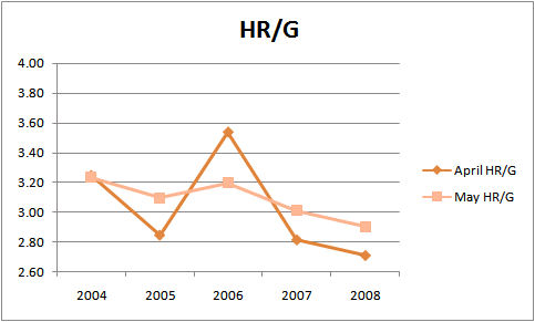 So the data centered around home run output leaves us with an uneven answer. April home run output was strong by comparison despite that month usually being excused due to inclement weather while the uptick generally enjoyed by the league in May was decidedly absent in 2008 despite the concentration of power being stronger or at least as strong as previous seasons.