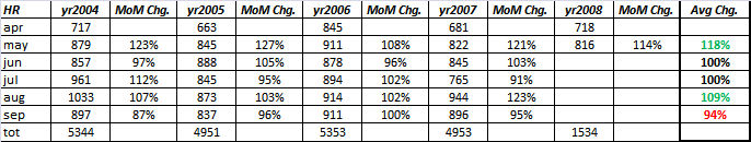 May, however, was a different story. Though just six off of the mark of 2007’s May, the 816 home runs reached just 94% of the average and qualified as the lowest total of the years studied. From 2004-2007, home runs saw a 20% increase from April to May. This year, there was only a 14% increase month-over-month bringing the five year average down to +18%. If the season follows pace and assumes the same percentage gains and losses established from 2004-2007, then there would be about 4900 home runs in 2008, the lowest of the years studied by over 50 home runs.