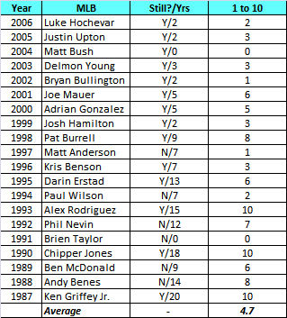 Only two of the eight picks from 1999-2006 look like they are going to fail as top picks. Hochevar, Upton and Young really deserve incomplete grades because the sample sizes to date are just far too small. Same could be said for Gonzalez, Mauer and Hamilton to a degree in we’re being honest. The Tigers could’ve used current GM Dave Dombrowski back in 1997 when they idiotically selected Matt Anderson. Perhaps he’d have seen the potential in Anderson’s teammate, Lance Berkman, who went to the Houston Astros 15 picks later.