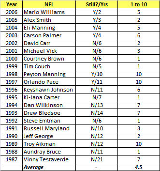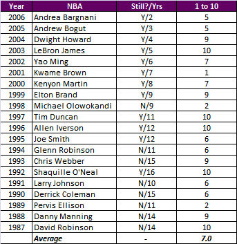 Easily the most popular draft of the four, the annual gathering in New York offers the biggest dud rate. Consider right off the bat that only seven of the last 20 top picks are even in the game and one is in federal prison. Given the physical demands of the game, it’s not terribly surprising that so few are still in the game. Ten of the 12 players drafted from 1987 to 1998 played 10 or more seasons so I don’t mean to downplay the overall quality of these #1 picks more than necessary. The 4.6 average is nipping at the heels of baseball’s score to get out of the cellar, but back-to-back bombs from the Browns in 1999 and 2000 with Tim Couch and Courtney Brown certainly haven’t helped matters.
