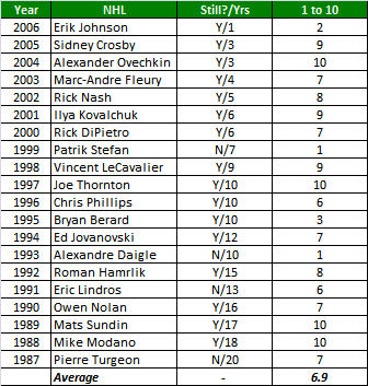 Not surprisingly, the NBA has the best success rate amongst #1 overall picks during the 20-year period studied. Any league that is going to have just two rounds in its draft had better have some talent concentrated at the top or else how would the bottom feeders replenish? The league tends to favor size since, as the adage goes, you can’t teach size. And for the most part, that size has panned out. In the 20 seasons looked at, I scored five 10s and four 9s. Only three players scored below a 5, the most recent being 2001’s Kwame Brown (1). Overall, the league scored a 7.0 average with 12 of the 20 players still in the league and seven of the remaining eight playing between 10-15 seasons (Michael Olowokandi, 9):