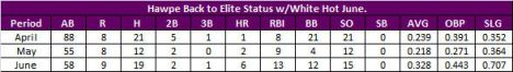 Few players are outdoing Dukes in June, but Colorado’s Brad Hawpe is certainly one that is since he came back from injury on June 6th. A Baseball By Paul favorite, Hawpe is up to a June line of .328/.443/.707 after a 2-for-4 effort on Tuesday night. A monthly breakdown seems to suggest he might’ve needed that DL-stint a little sooner: