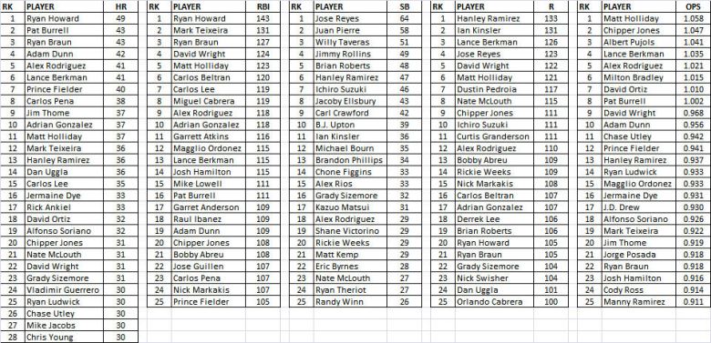 This set of lists covers the Top 25 across the main roto categories of home runs, runs batted in, stolen bases and runs scored. I took OPS instead of batting average because I (as many do) find it a better measure of a player’s value. I realize average or even on-base percentage are used in fantasy scoring, but went with the OPS anyway.