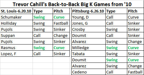 Going back to that pair of strikeout-heavy games from 2010, we see that Cahill was not reliant upon the curveball to amass those 17 punch outs across two starts. In the first against St. Louis, just two of the seven came on swinging curves. The same was true in the 10-strikeout effort against Pittsburgh giving him four in 17 (24%) as opposed to his six in 15 (40%) for the first two starts of this year. In fact in the two interleague games he only threw 30 curveballs (nearly half the total of what he’s thrown so far this year) out of 203 pitches (15%) only 1/3rd of which were swung at and eight of those were missed entirely.