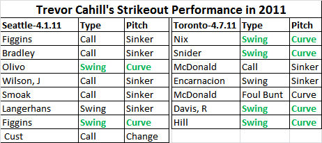 So where does all of this leave us? With just two games of data, it would be foolish to make definitive statements about Cahill’s strikeout ability, but in the small sample we are seeing a change in approach that marries well with past history from the minor leagues. He is just 23 this year so it isn’t at all out of the question to expect some growth, especially with his pedigree as a prospect. From a fantasy perspective, I would be heartened by the change if I owed him, but if I was in need of strikeouts I wouldn’t rush out to trade for him just yet.