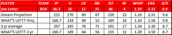 Last but not at all the least is Lester.  A popular pick for the American League Cy Young, including mine, he is showing why so many thought he could bring home the hardware this year.  Outside of Halladay, he has the least downside in his profile should he “only” reach his three year average by season’s end.  Part of that is because his ERA and WHIP aren’t as good as the others right now, but the other part is because his three year average is very strong.
