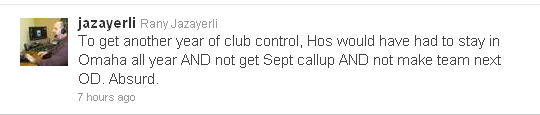 Well Ka’aihue couldn’t even hit his weight (240 lbs.) which might have been enough to stave off Hosmer a bit longer even though it would’ve been a far cry from the .319 he hit a year ago and the .292 he has posted in the last three years in the minors.  By the way, for those concerned with the financial implications of calling up Hosmer, check out this tweet from Royals aficionado Rany Jazayerli:
