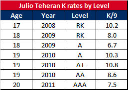 In his 15-inning debut back in 2008, he struck out 10.2 per game.  He followed that up with 7.4 per game in 81 innings as an 18-year old in 2009.  Then he ramped it back up to an even 10 last year in his best season yet which totaled 143 innings.  It could just be him getting used to the tougher competition, too.