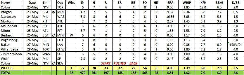 Stupid ESPN scoreboard. They told me Bartolo Colon was pitching on Sunday against Seattle. Alas he did NOT, instead pitching on Monday while teammate CC Sabathia got the nod against the Mariners. That little mishap cost this week’s set of picks the chance at a sub-4.00 ERA. The week started off poorly with Colon allowing six in six against Toronto and his supposed counterpart for today, Jason Vargas, getting knocked around on Monday, too.