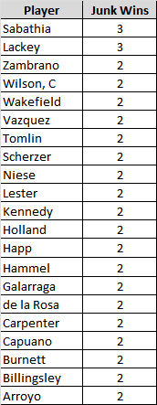 If you want a really ugly junk win, look at Jo-Jo Reyes‘ from July 14th against the Yankees when he went 5.3 innings and allowed seven runs on 10 hits and a walk while striking out just two and allowing two home runs yet still coming away with a win as the Jays bum-rushed Bartolo Colon for eight runs in the first inning. See what I mean about them not all being created equally? I used four runs as the cutoff because six innings and three earned runs is the baseline for a quality start. Of the 97 junk wins so far this year, 34 saw the pitcher allow 5+ earned runs while the other 63 were the baseline four. And of those 63, 51 of them saw the starter go 6+ innings.