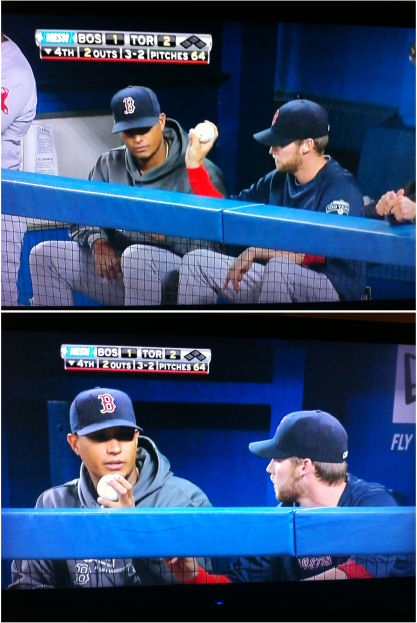 I love this kind of stuff. Probably because I’m a nerd. This is Felix Doubront and Daniel Bard discussing pitching in the Red Sox dugout during Wednesday afternoon’s game in Toronto. I know this probably happens in every dugout from the Majors to Single-A ball so I’m not pretending it’s rare, I just like when they show us on camera. I’m already a huge Doubront fan and while I was down on Bard coming into the season, his debut against the Jays was impressive as it included 17 swing-and-misses. One start isn’t enough to completely change my opinion, but I’m at least slightly more intrigued than I was during Spring Training.