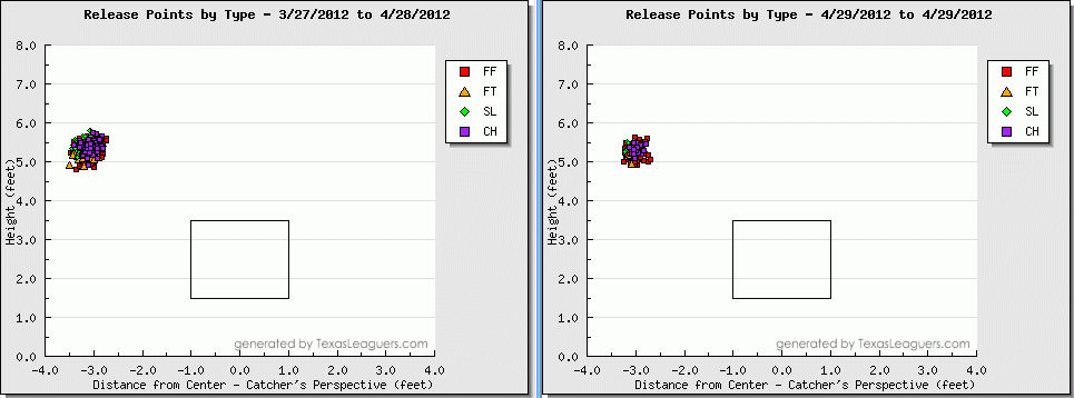 Just as with the fastball, he isn’t throwing nearly enough strikes with the secondary stuff as his slider is crossing the dish just 59% of the time, down from 63% in 2011. Meanwhile, when it does go for a strike it is often being obliterated as hitters have a 1.224 OPS in plate appearances that end on a slider. That is nearly twice the .617 OPS from last year. Furthermore, the change is doing nothing to stifle southpaws. He has a 59% strike rate on the changeup against lefties and they are battering it to the tune of a 1.065 OPS, numbers that were at 66% and .721 a season ago, respectively.