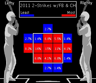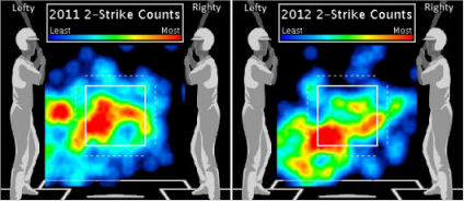 Control is putting the ball in the zone, command is putting the ball where you want it in the zone. In 2012, his called strike percentage in two strike counts is up to 11% with the fastball and 18% with the changeup. I didn’t include the slider because he doesn’t get called strikes with it (1 in ’11; 0 this year) and doesn’t really need to since it is his swing-and-miss pitch. Look at the heat maps of his two strike pitches to get an even better idea of the difference between command and control.