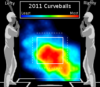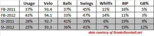 Gonzalez has a true hammer curveball. It is his best pitch, his strikeout pitch, and one of the better ones across baseball. He has taken it to another level this year. First off, he has been more selective with it throwing it 20% of the time, down from 28% a season ago. It is easily the lowest usage rate of his career, his first time below 25% in fact, and batters are having an even tougher time doing anything with it in 2012. He is throwing it for a ball nearly 3% more at 45%, but he is generating more called strikes and whiffs with it, too.