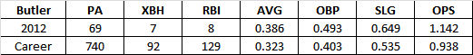 Butler has always handled lefties, but this year’s power surge against them has put him on pace to push the 30-home run barrier for the first time in his career. He was popping a home run every 24 at-bats coming into this season, but has upped that mark to every 14 at-bats with 4 in 57 AB so far. Butler still hits pretty well against righties with a .288 average, but his slugging dips 100 points to .434 meanwhile he actually has more walks (99) than strikeouts (93) vs. LHP.