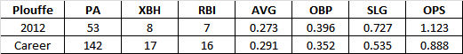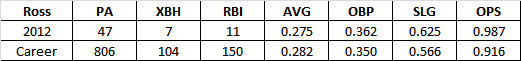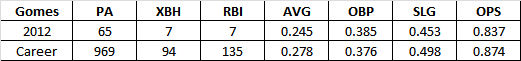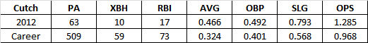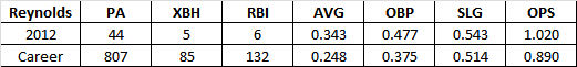 Reynolds hits for average against no one and hits for power against anyone, but he is exceptional at getting on base and hitting for power against lefties specifically. He didn’t hit his first 2012 HR until May 4th so he only have 1 against lefties and 5 overall, but four doubles in his 12 hits vs. LHP gives him that gaudy SLG so far this year.