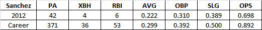 Sanchez’s performance this year has been one steeped in relativity. A .698 OPS inspires exactly nobody, but compared to his .449 mark against righties, it is clear he fares better against lefties. And his career record, filled with much more appealing data, bears that out as well with a 177-point edge.