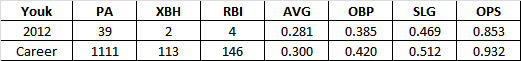 Youk has been an abomination on the whole this year, but he is still popping lefties to the tune of a solid .853 OPS (compared to his putrid .586 mark against right-handers). He has held an advantage against lefties, but it was usually accompanied with an excellent mark against righties, too (career .852 OPS). His career mark against lefties is essentially equal to 2010-2011 Troy Tulowitzki (.931 OPS in 1135 PA).