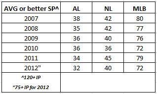 However, a look into his game log shows that he struggled to work the kinks out after spending most of 2011 on the shelf, but turned a corner in early May and has been quite excellent since then. The Padres tattooed him for six runs in 2.7 innings in Petco back on May 4th pushing his ERA up to 6.61. To that point, he had gone more than six innings just twice and completed the seventh just once. Since then he has a 2.47 ERA and 1.13 WHIP in 66 innings across 10 starts going fewer than six innings just once and going seven or more in six of the 10.