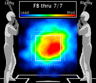 In his short 2011 sample, his flyballs hit off the inner third of the strikezone yielded a 5-for-12 (.417) mark with all five hits leaving the yard. He hit .297 (11-for-37) off the inner third as a whole in 2011. In 2012, he hit just four home runs off the inner third accounting for all four of his flyballs hit in nearly twice as many tries as he went 4-for-23 (.174). He still did plenty of damage off the inner third as a whole going 26-for-76 (.342), but pitchers got better at jamming inside to limit the damage to mostly singles (15 of the 26 hits). He wasn’t turning on those inner third meatballs like this one from 2011:
